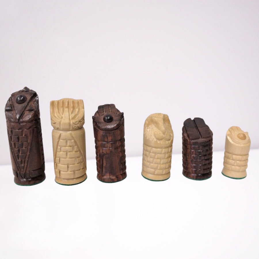 Chess pieces designed to resemble ancient Jewish symbols, made of valued sorts of wood, felted